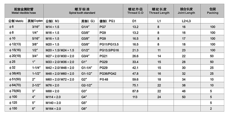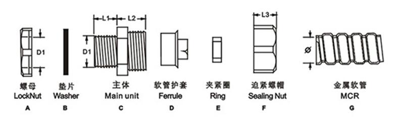 产品特性 加厚型锌合金镀锌或镀铬、外型美观、结构紧密、强度高。 软管护套设计与软管相扣接紧之设计、装配省时便利,抗拉力强。 可防水、防尘、抗盐、耐酸碱、酒精、油、脂及一般溶剂。 除以下标准规格外,可按要求任意变动大小及螺纹标准。 产品描述 产品材质: A.C.F部位采用优质加厚型锌合金制成、B.E部分采用丁腈橡胶制成、D为铁皮制成。 螺纹规格: 英制G、公制Mefyic、德制PG。 产品颜色: 金属色(银白色)。 工作温度: -40℃~+100℃,短时可达+120℃。 防护等级: Ip65