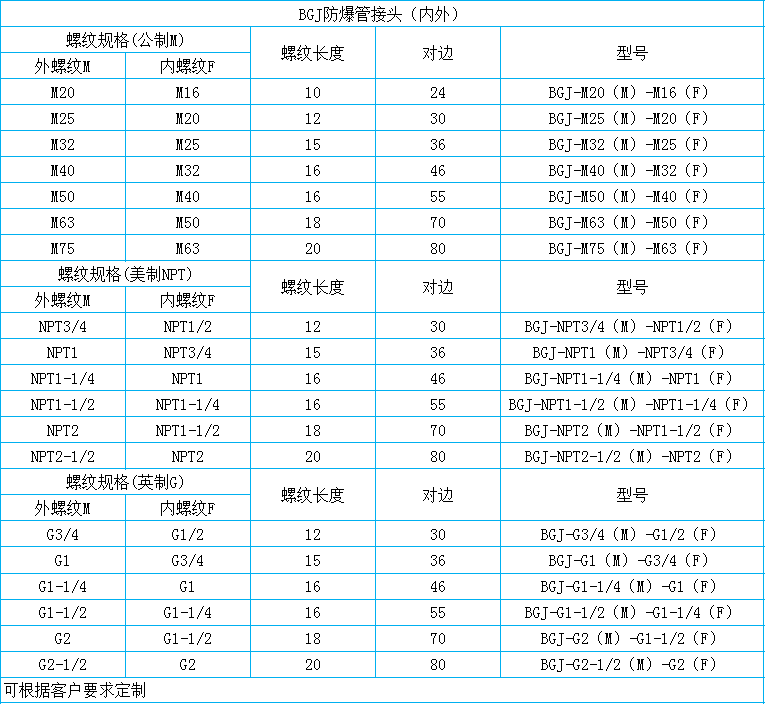 适用范围:适用于石油开采、炼油、化工、军工等危险环境场所,适用于爆炸性气体I区、2区场所,适用于可燃性粉尘环境20区、21区、22区场所,适用于IIA、IIB、IIC类爆炸性气体环境,技术参数防爆标志:ExdIIC Gb防护等级:IP68工作温度:-60°-100°产品材质:不锈钢和黄铜镀镍接口螺纹:M公制螺纹、NPT美制螺纹、G英制螺纹执行标准:GB3836.1、GB3836.3