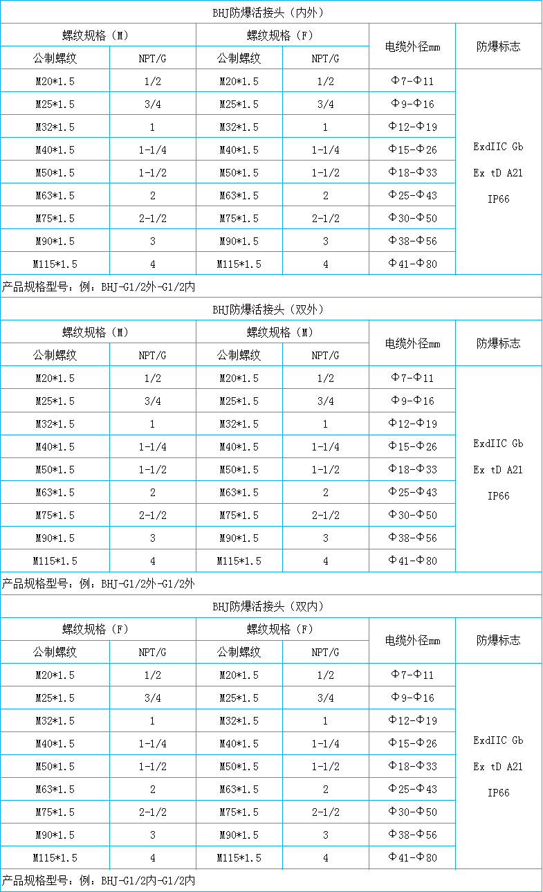 适用范围:适用于石油开采、炼油、化工、军工等危险环境场所,适用于爆炸性气体I区、2区场所,适用于可燃性粉尘环境20区、21区、22区场所,适用于IIA、IIB、IIC类爆炸性气体环境,技术参数防爆标志:ExdIIC Gb防护等级:IP68工作温度:-60°-100°产品材质:不锈钢和黄铜镀镍接口螺纹:M公制螺纹、NPT美制螺纹、G英制螺纹执行标准:GB3836.1、GB3836.3