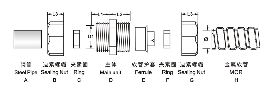 产品材质: C、 E部位采用304不锈钢制成、F部分采用丁腈橡胶制成、D为 制成产品颜色: 金属色(银白色)工作温度: -40+100, 瞬间可耐热达120防护等级: IP65产品特性:1、304不锈钢,外形美观,结构紧密、强度高2、软管护套设计与软管相扣接紧之设计、装配省时便利,抗拉力强3、可防水,防尘、抗盐、耐酸碱、酒精、油、脂及一般溶剂除以下标准规格外,可另按需求任意变动大小及螺纹标准